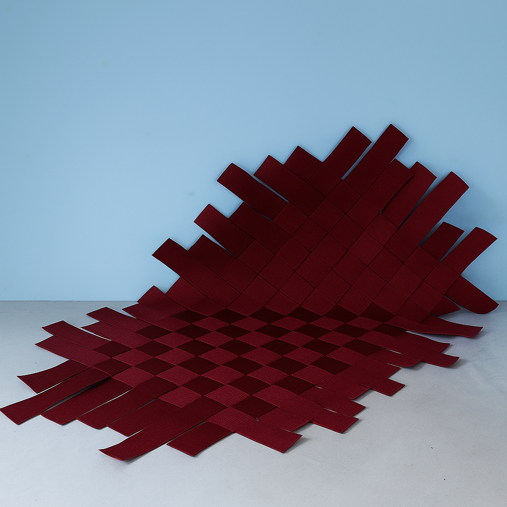 Der Teppich wird händisch aus Gurtbändern - made in Germany - gewebt. Die freie Form entsteht intuitiv und schimmert je nach Lichteinfall in verschiedenen Nuancen.