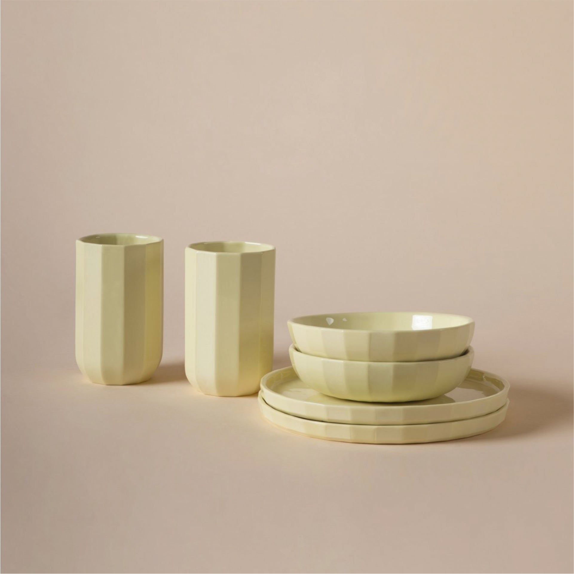Die Serie FACET spielt mit der Wirkung von Farbe, Material und Oberfläche. Das subtile Streifenmuster und die skulpturale Form verleihen dem Set eine besondere Präsenz – funktional im Alltag, ausdrucksstark als Design Statement.