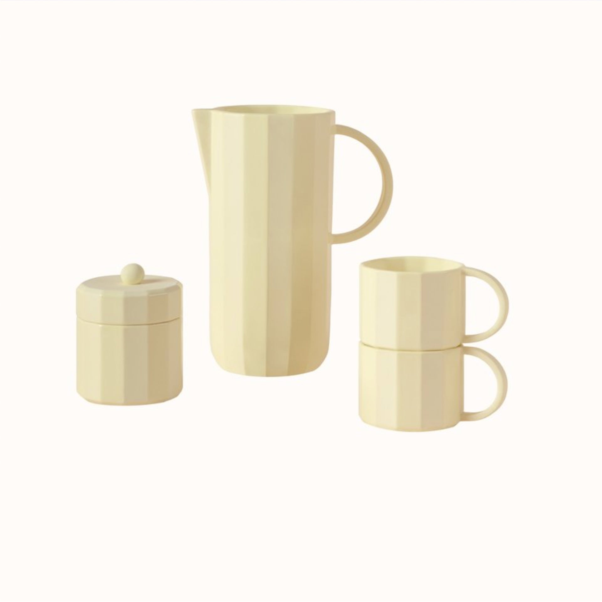 Die Serie FACET spielt mit der Wirkung von Farbe, Material und Oberfläche. Das subtile Streifenmuster und die skulpturale Form verleihen dem Set eine besondere Präsenz – funktional im Alltag, ausdrucksstark als Design Statement.
