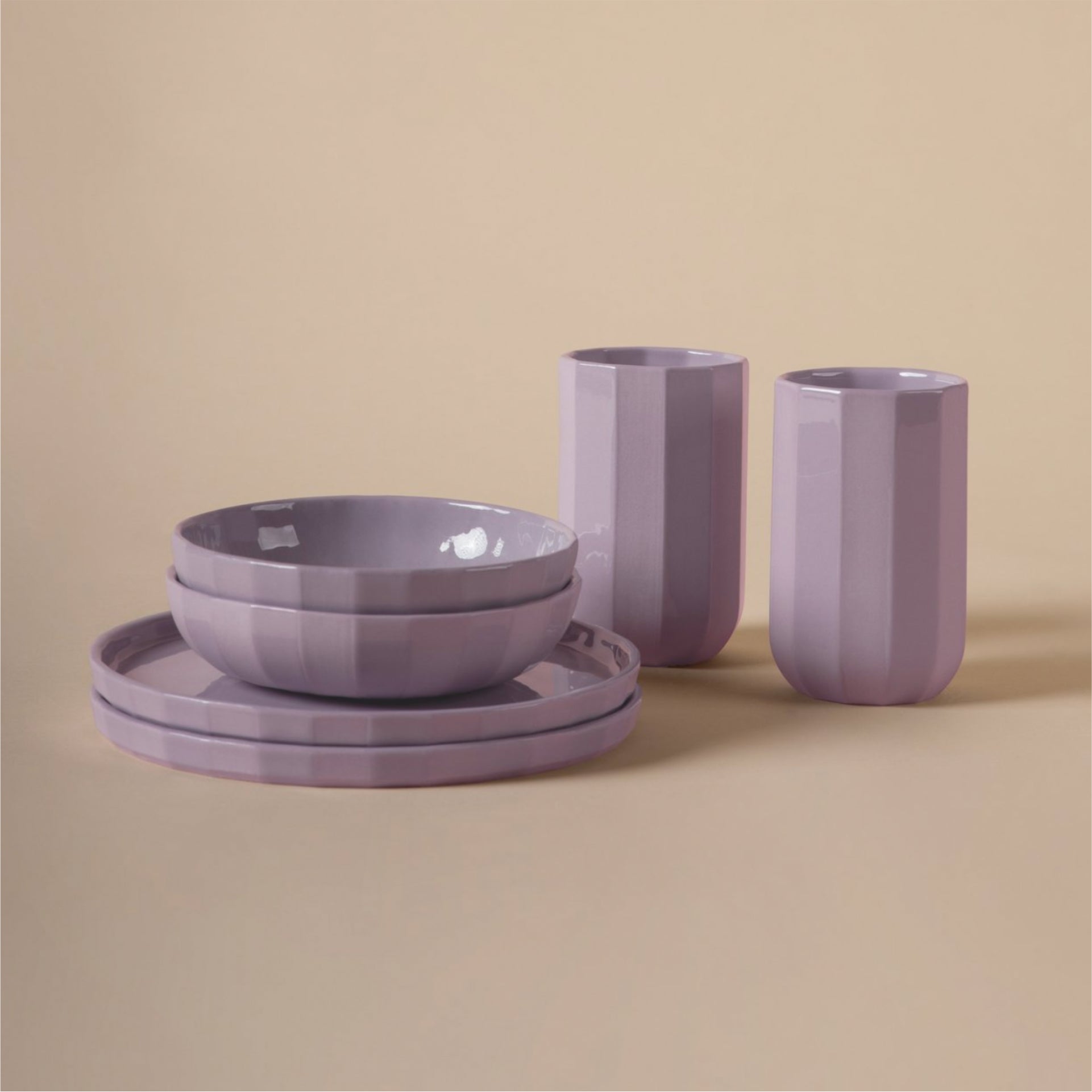Die Serie FACET spielt mit der Wirkung von Farbe, Material und Oberfläche. Das subtile Streifenmuster und die skulpturale Form verleihen dem Set eine besondere Präsenz – funktional im Alltag, ausdrucksstark als Design Statement.