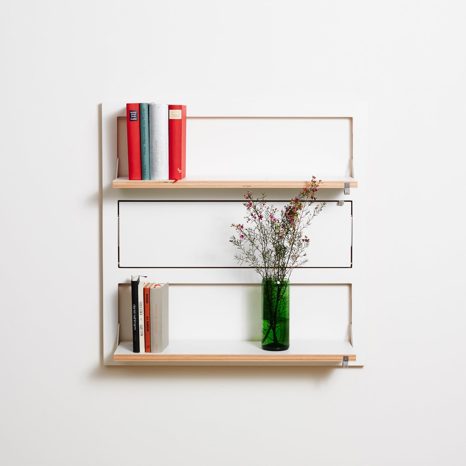 Das individuell kombinierbare Regal aus der Serie FLÄPPS ist Teil des flexiblen Wandsystems von AMBIVALENZ.