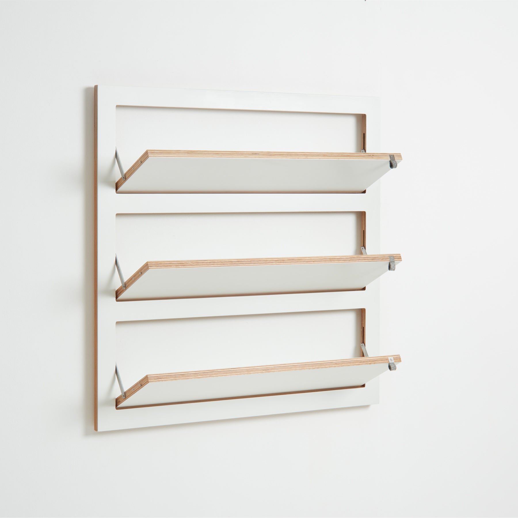 Das praktische Schuhregal aus der Serie FLÄPPS ist Teil des flexiblen Wandsystems von AMBIVALENZ.