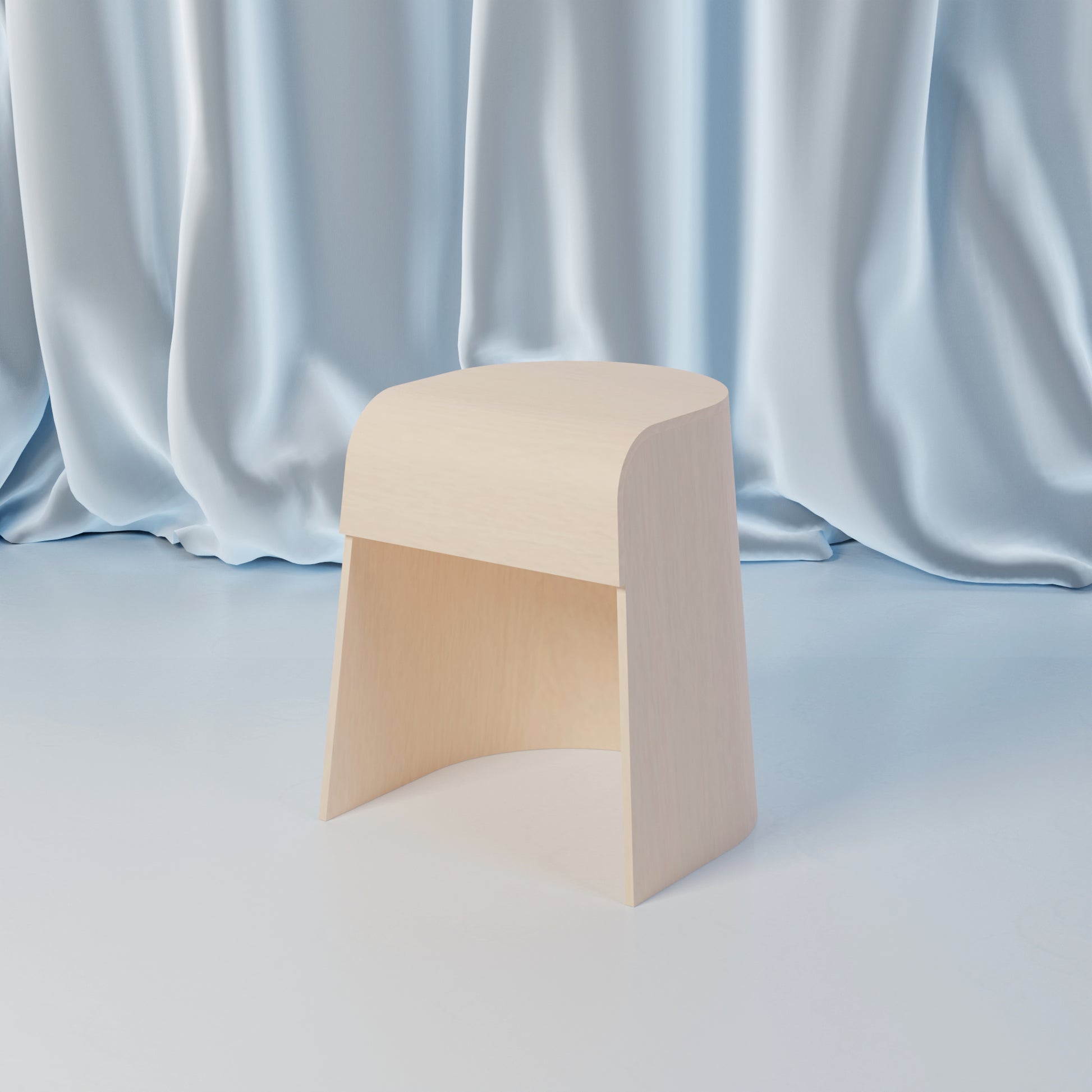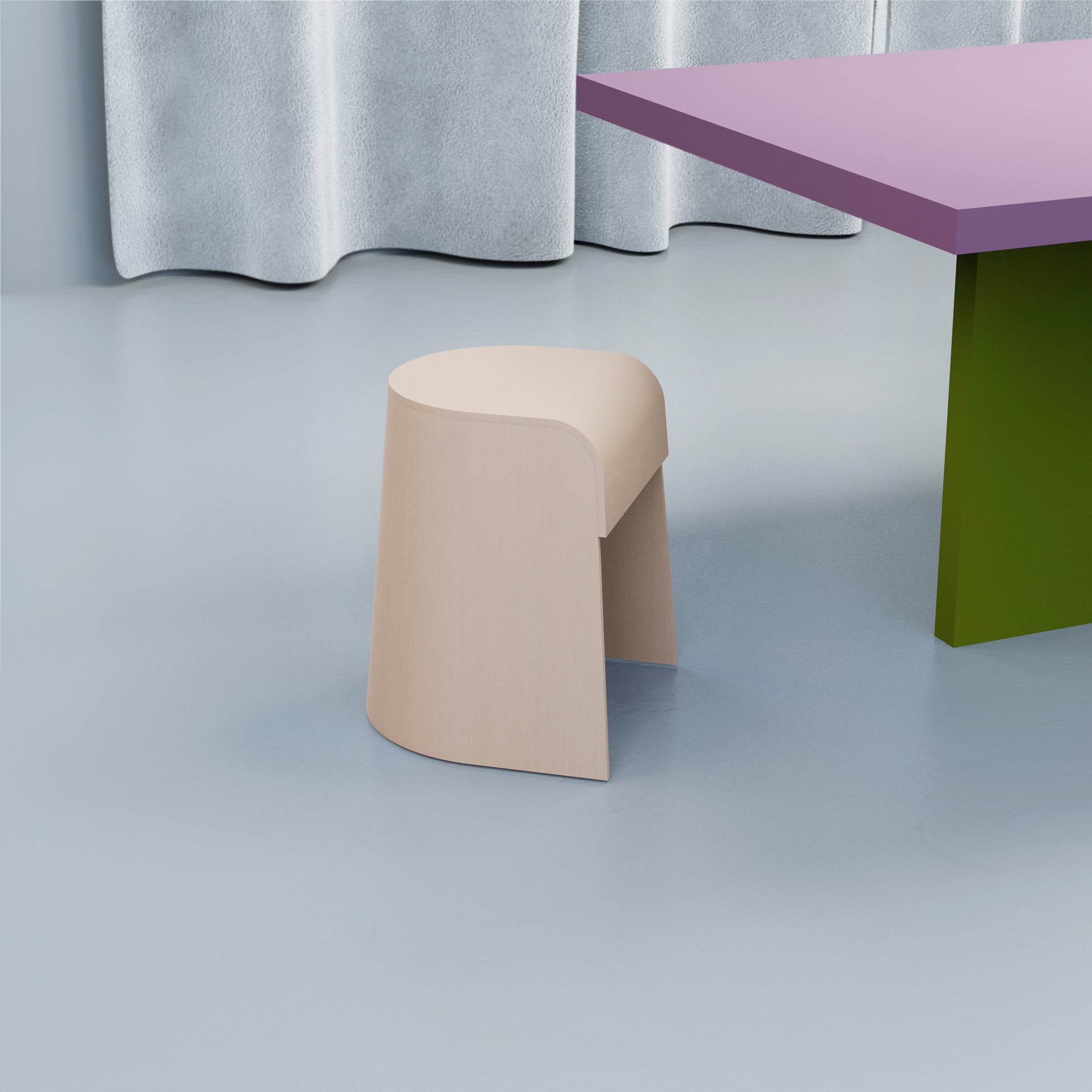 Das stapelbare Objekt NEUBAU von KLEMENS SCHILLINGER ist das Ergebnis zahlreicher Experimente mit gebogenem Sperrholz, das durch seine Verarbeitung zum stabilen Hocker und Beistelltisch wird.