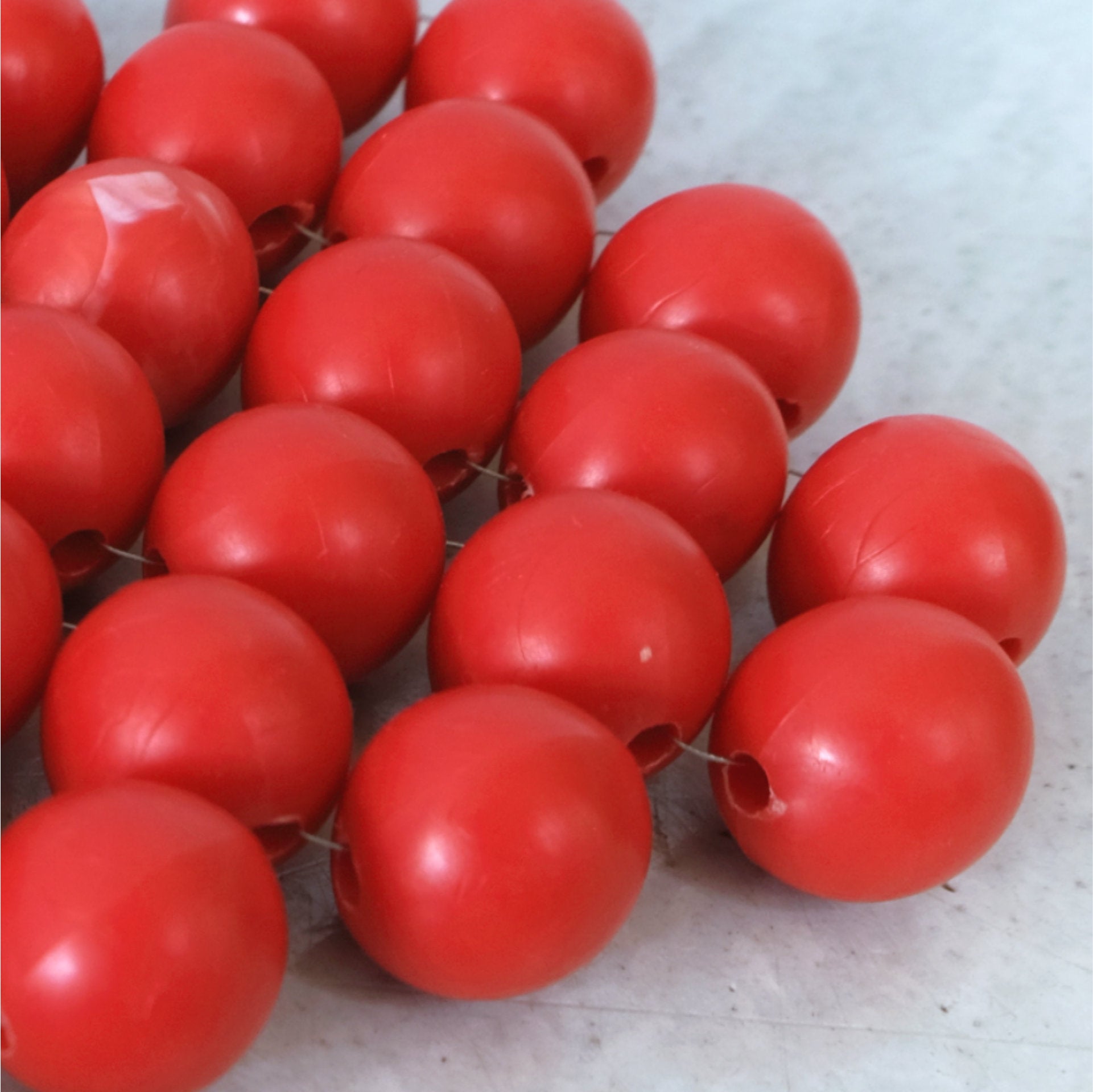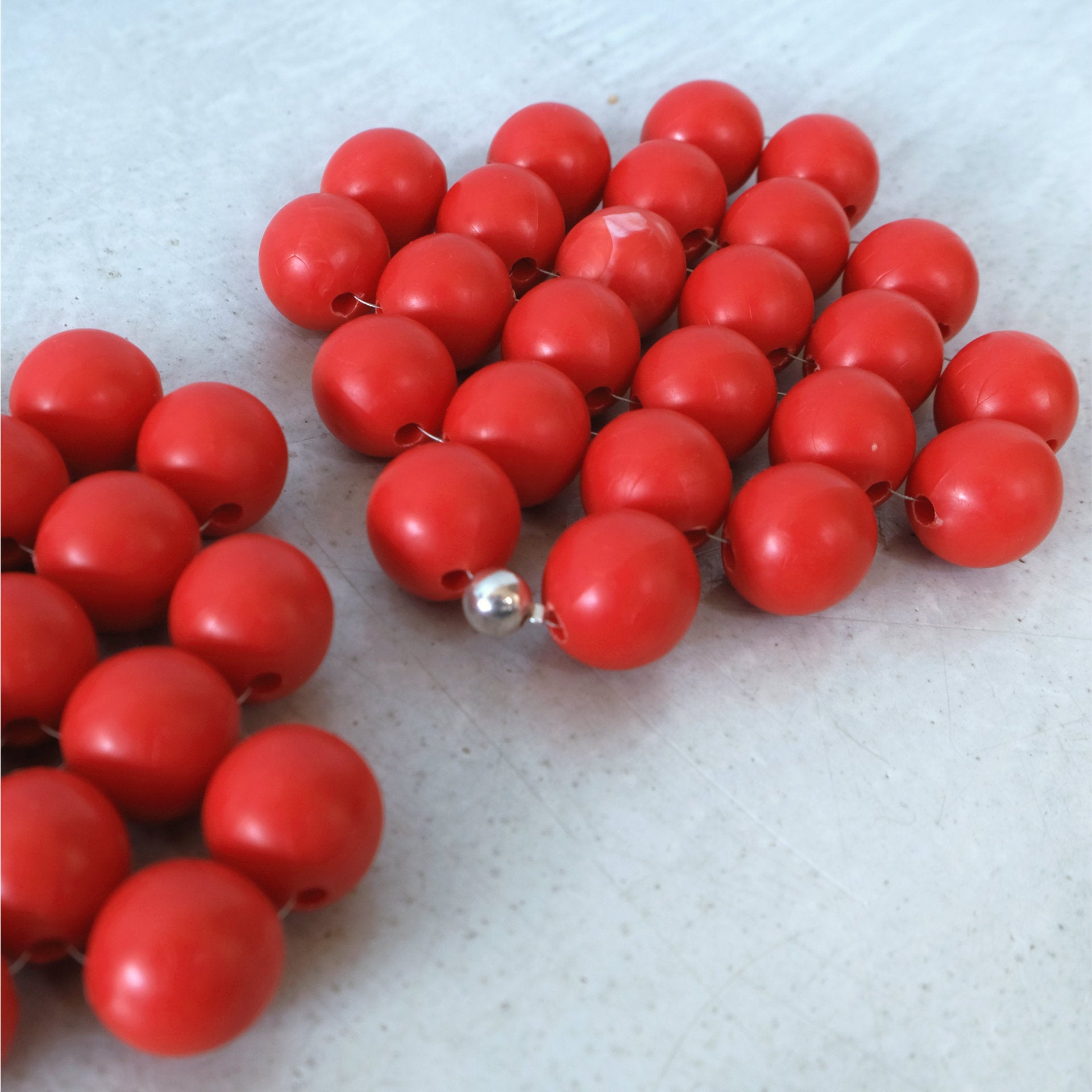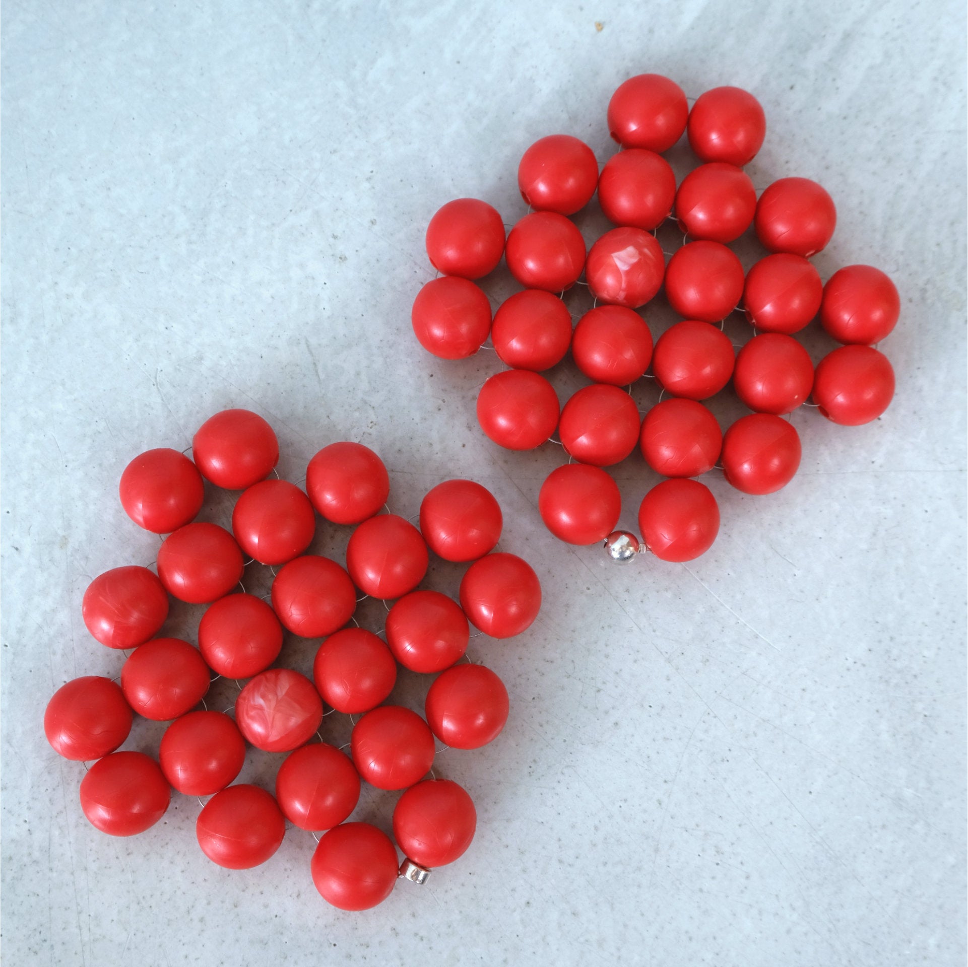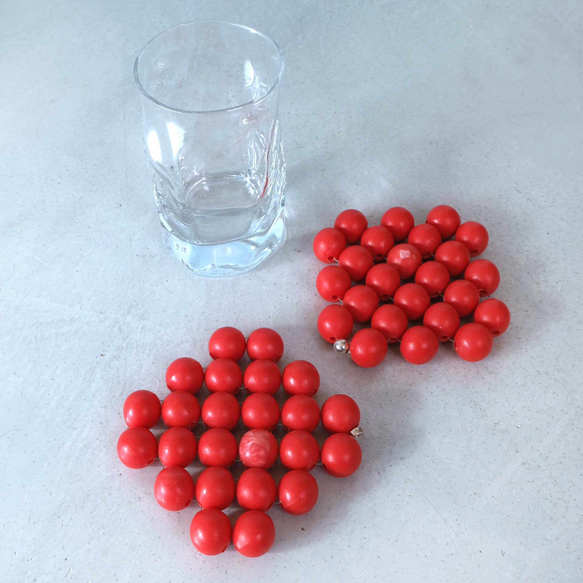 Eine versilberte Perle ziert den Abschluss der aus großen roten Perlen handgewebten Untersetzer. Die Perlen aus robustem Kunststoff sind Originale aus den 70ern. Jede ein Unikat!