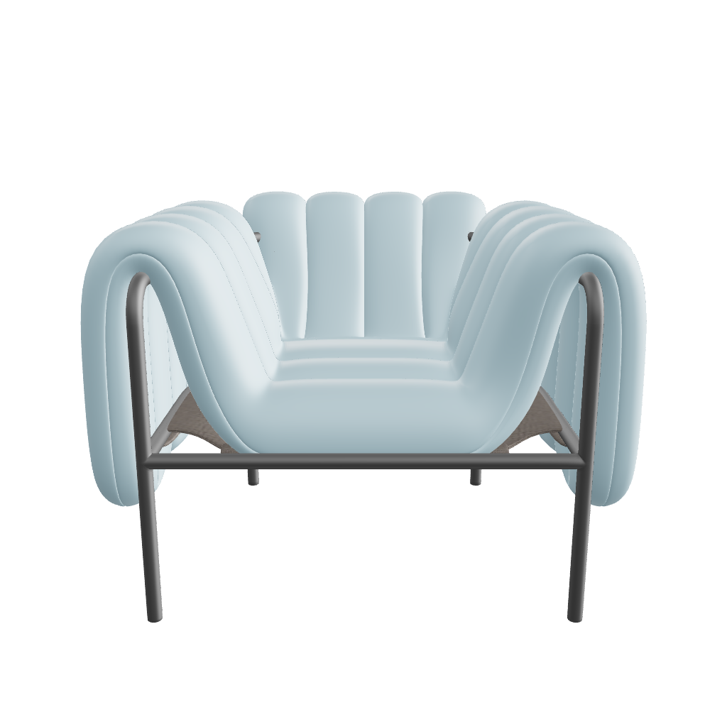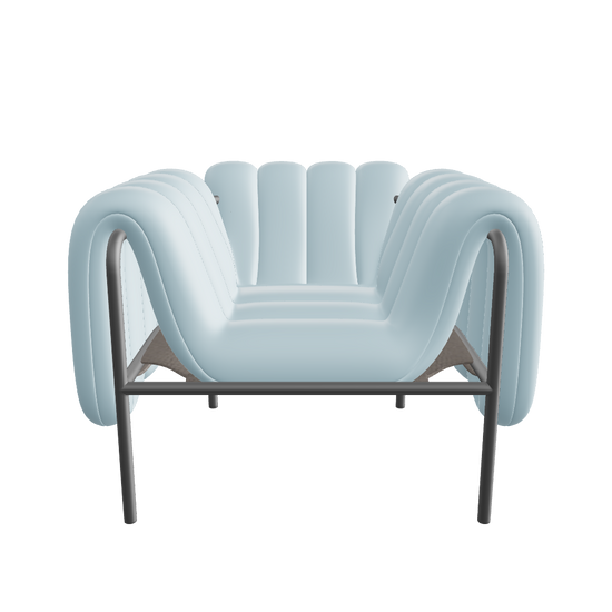 Der Rahmen des Puffy Chair besteht aus sandgestrahltem Edelstahl, die Polsterung aus edlem Leder in sanftem Blau.