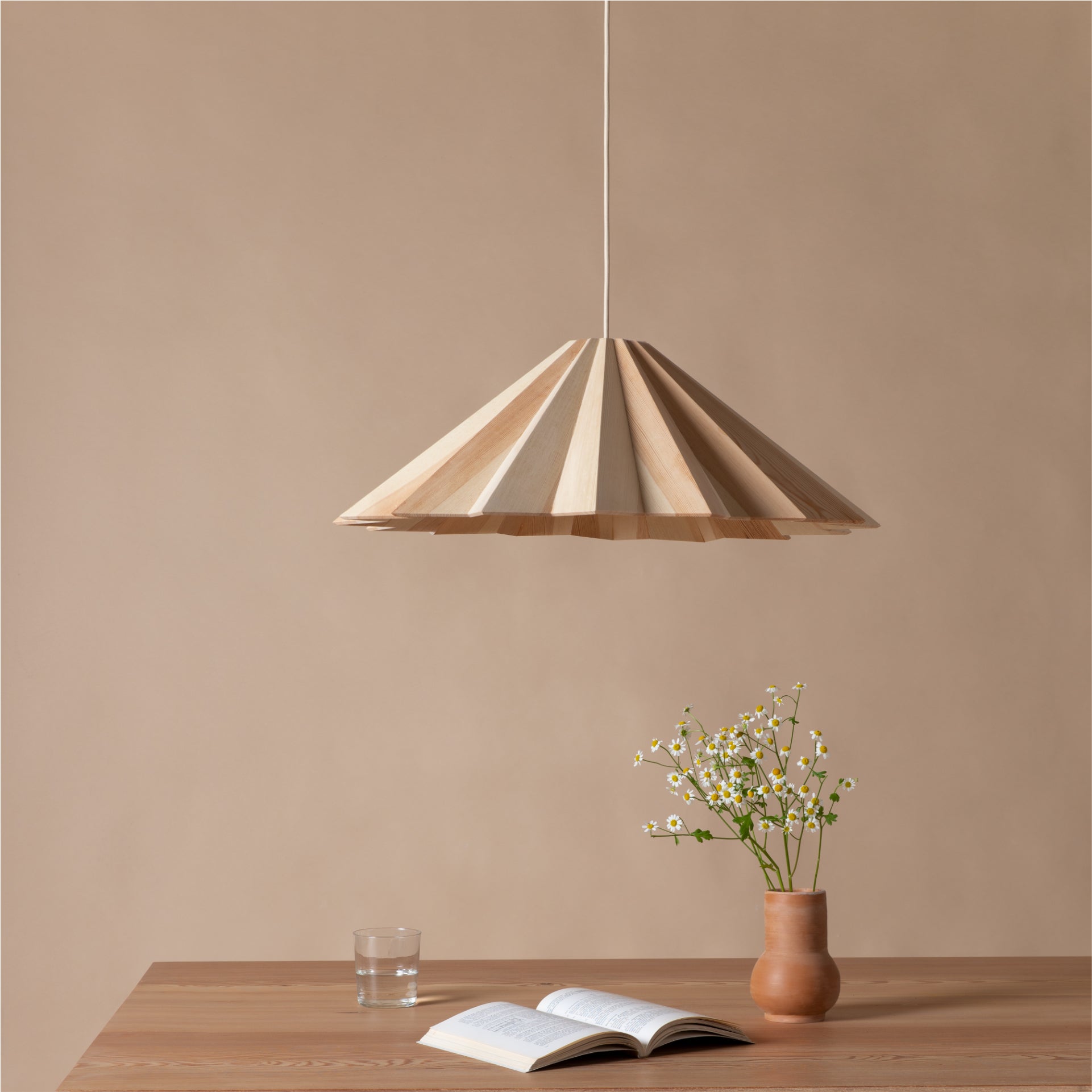 Inspiriert von der Baukunst traditioneller Musikinstrumente, nimmt STRATUS die Silhouette gefalteter Textillampenschirme auf und interpretiert sie neu. Die natürliche Haptik des Holzes verleiht ihr eine warme, zeitlose Präsenz.