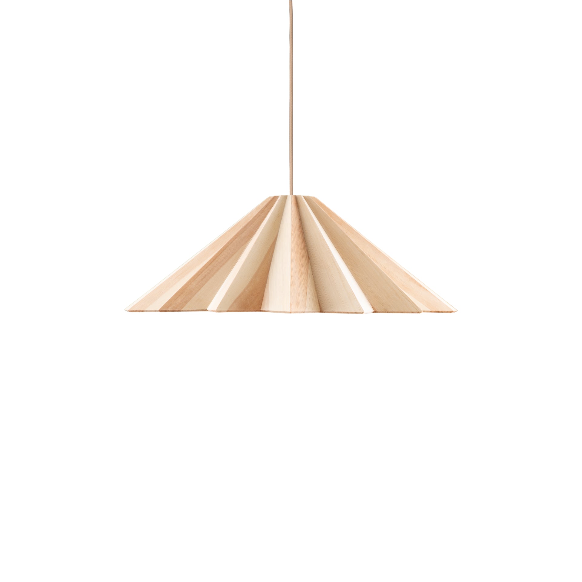Inspiriert von der Baukunst traditioneller Musikinstrumente, nimmt STRATUS die Silhouette gefalteter Textillampenschirme auf und interpretiert sie neu. Die natürliche Haptik des Holzes verleiht ihr eine warme, zeitlose Präsenz.